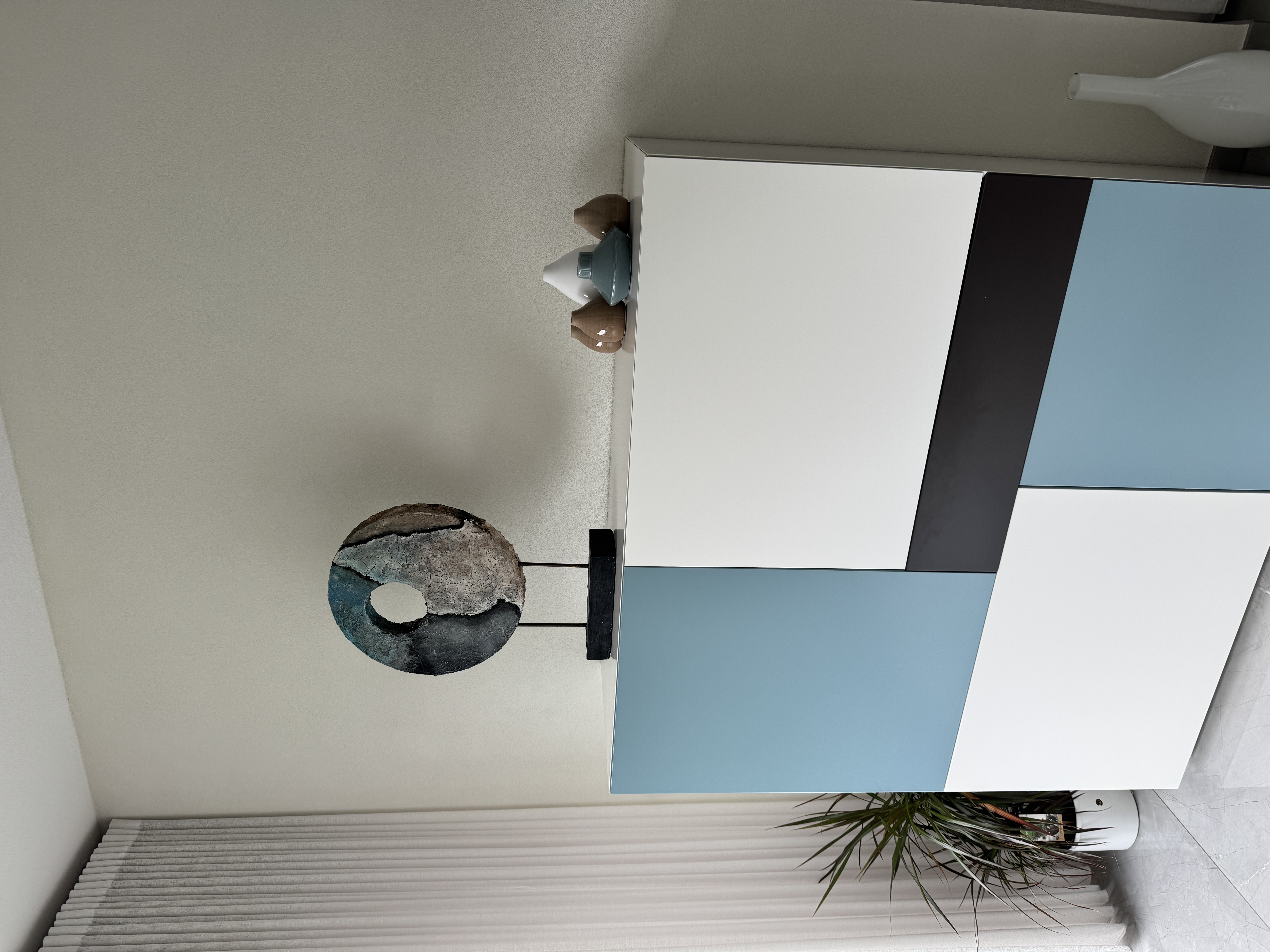05-10-2025 • Tijdens de Kunst & Cultuurroute kwamen ze speciaal even langs omdat ze mijn werk gezien hadden in Emmen Centrum. De volgende dag ben ik even bij hen thuis langs geweest met 2 werken waarvoor ze interesse hadden. De keuze viel al snel op de ronde met het blauw. Zoals je op de foto kunt zien een prachtige keuze bij hun interieur. Henk en Marian heel veel plezier ermee!